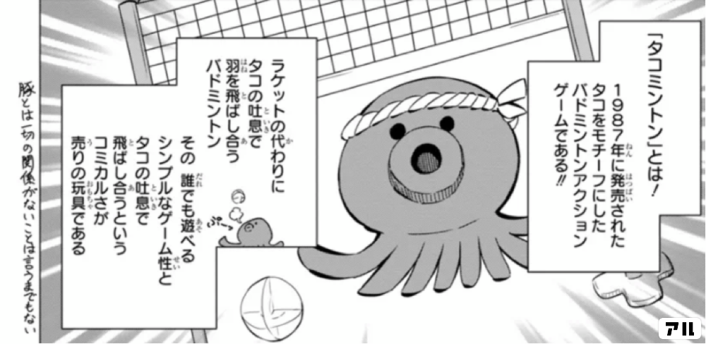 タコミントン とは 1987年に発売されたタコをモチーフにしたバドミントンアクションゲームである ラケットの代わりにタコの吐息で羽を飛ばし合うバドミントン その 誰でも遊べるシンプルなゲーム性とタコの吐息で飛ばし合うというコミカルさが売りの玩具である 万代